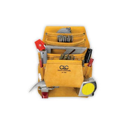 A premium quality, leather nail and tool bag with 4 main pockets and 6 smaller pockets and sleeves to hold a variety of nails, fasteners, and tools, includes a hammer loop and a tape measure clip.